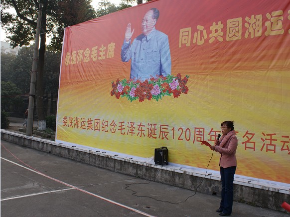 今年是毛澤東主席誕辰120周年,是公司深入學習貫徹黨的十八屆三中全會精神,踏上新征程的開局之年。12月24日上午9時許,公司在老機關院落籃球坪隆重舉行“永遠懷念毛主席、同心共圓湘運夢”紀念毛澤東誕辰120周年離退休老同志大型簽名紀念活動,緬懷先烈們的豐功偉績。公司婁底片離退休、 內退、協保同志近四百人參加了此次活動。公司董事長兼總經理彭瑞華、監事會主席吳一江等公司領導親臨活動現場。
