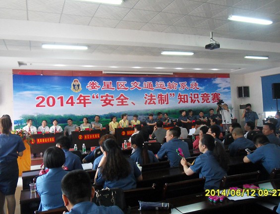 6月12日上午, 2014年婁星區交通運輸系統“法制、安全”知識競賽在區交通運輸局8樓會議室舉行,區人大副主任龍曉濤、副區長廖亞斌、區政協副主席彭國忠及市交通局有關領導親臨現場。