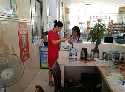 旅客(右一)在服務(wù)臺(tái)免費(fèi)取用防暑降溫藥